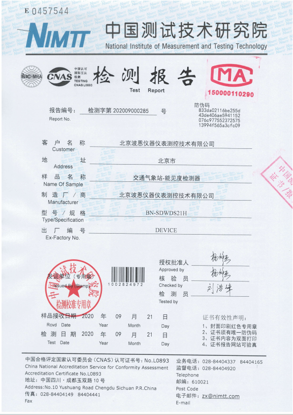 波恩儀器能見度檢測器檢測報(bào)告