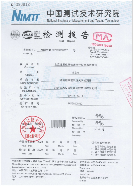 波恩儀器超聲波風(fēng)速風(fēng)向儀檢測報(bào)告